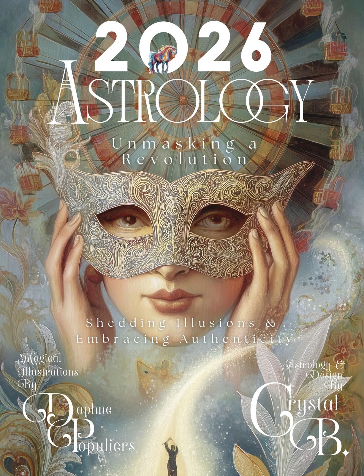 I am thrilled to announce that the big project I have been working on this year is now available to the public! Step into Unmasking a Revolution, the transformative theme of the 2026 Astrology Guide written by New Jersey–based astrologer Crystal B. Bichalski, featuring my original illustrations to bring the year’s cosmic story vividly to life. Whether you prefer the tactile experience of a printed soft-cover book or the convenience of a digital format, this guide offers inspiration and insight to support your year of awakening and bold transformation.
